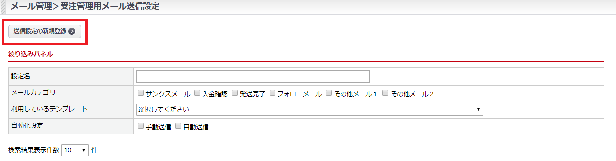 メール > 受注管理用メール送信設定【送信設定の新規登録】ボタンから編集画面を開きます。