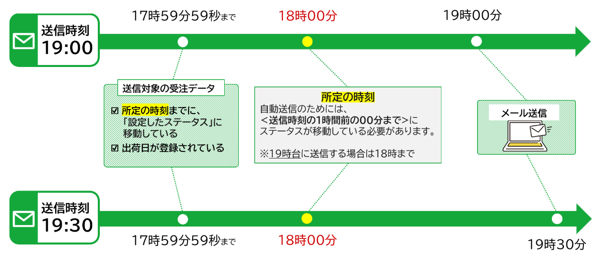 2. 設定で設定した送信時刻の1時間前の00分までに、メール送信前の受注ステータスに受注が入っている