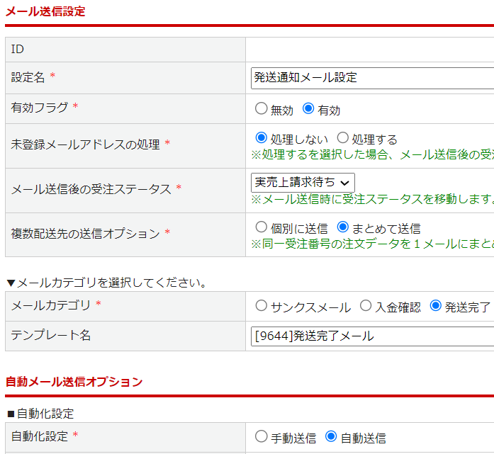 発送完了メールを自動送信するには、 メール > 受注管理用メール送信設定 での設定以外にも