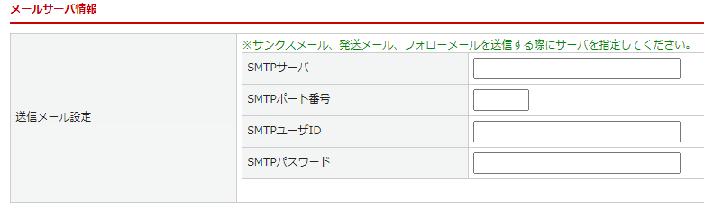 サンクスメール、発送メール、フォローメールを送信する際のメールサーバ情報を設定する画面です。