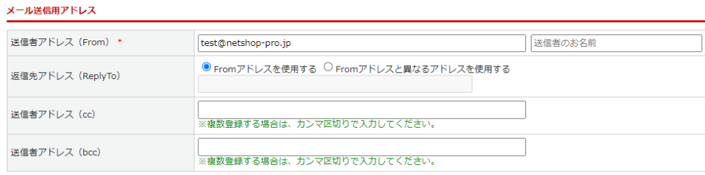 送信者アドレス(From)*送信元としたいメールアドレスを設定。右側の入力欄から送信者名も登録可能。