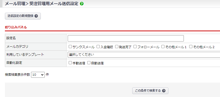 登録済の受注管理用メール送信設定を絞り込み条件で検索し、【この条件で検索する】ボタンをクリックすることで、一覧で確認できます。