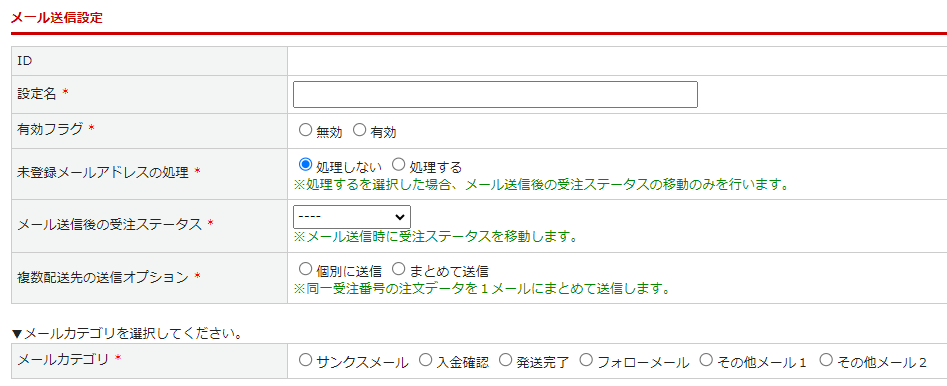 | ID | メール送信設定を登録すると自動採番されます。 |