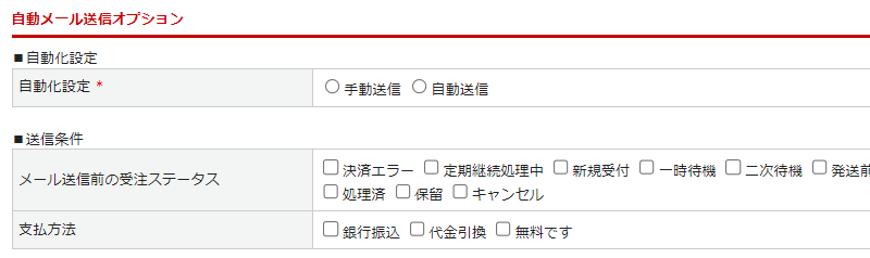 | 支払方法 | 手動送信、自動送信ともに、メール送信対象となる決済方法を指定できます。 |