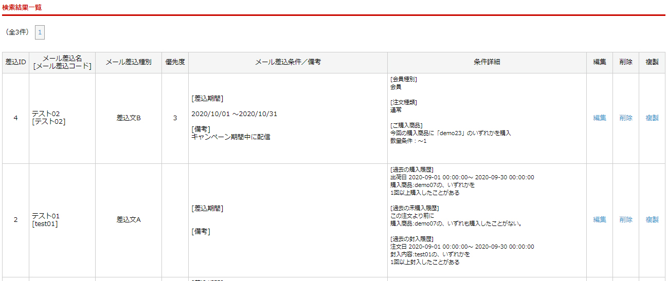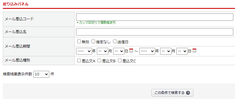 | 条件詳細 | 自動差込登録時に設定したメール差込条件の詳細 |