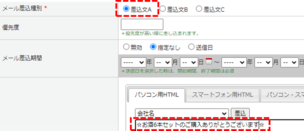 | メール差込期間 | 差込文を差し込む期間を指定します |