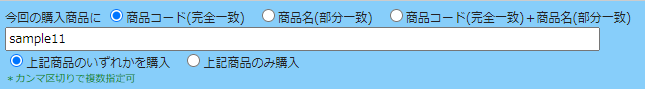 | ご購入内容 | 今回のご注文のご購入内容、封入内容を条件とする場合に指定します。 ※封入内容とは、受注>封入物管理で設定しているチラシ等の封入物を指します。 |
