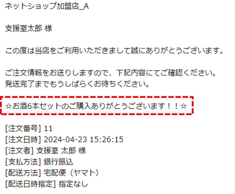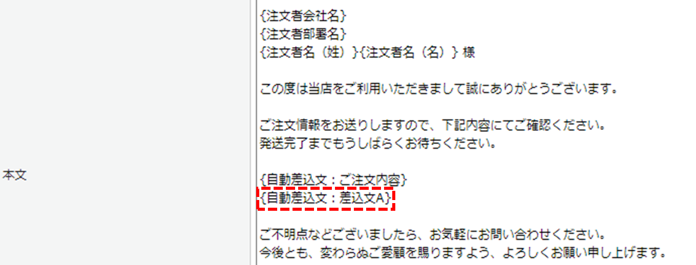 今回は、参考として「ご注文確認メール」のテンプレートに設置