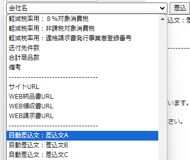 | メール差込種別 | 差込種別を指定します [差込文A][差込文B][差込文C]がデフォルトで設定されています。 選択肢を変更するには、<システム設定>マスター管理>受注管理>の[メール自動差込種別]より追加や編集が可能です |