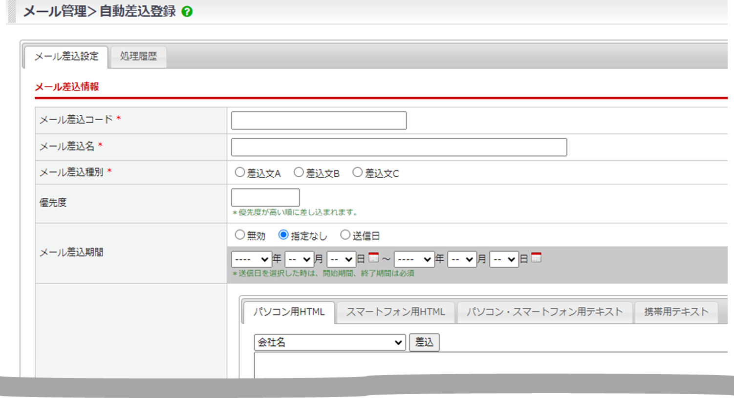 | メール差込種別 | 自動差込登録時に設定したメール差込種別 |