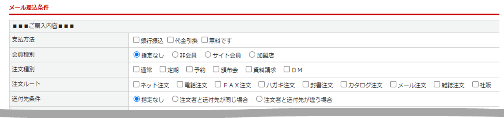 過去の購入商品やメール差込履歴で条件を指定する場合に設定します。