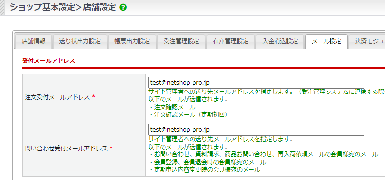 [店舗設定] > [メール設定] タブより【問い合わせ受付メールアドレス】をご確認ください。
