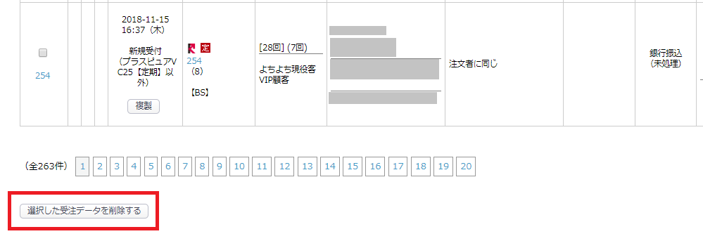 受注 > 受注一覧 の下部にある「選択した受注データを削除する」ボタンから削除が可能です。