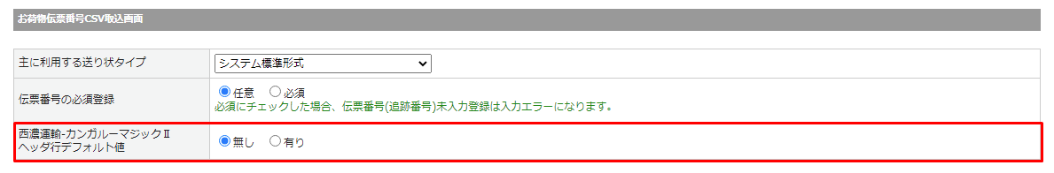 受注 > お荷物伝票番号CSV取込 のCSVヘッダ行の初期値になります。