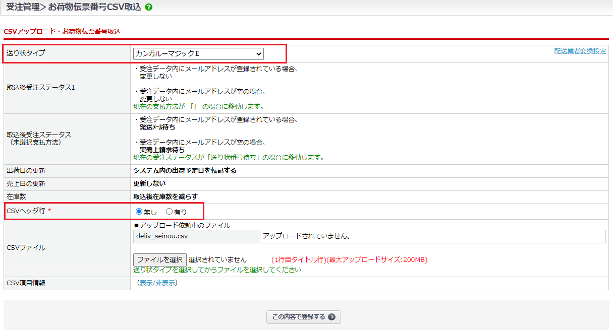 取込CSVファイルのヘッダ行について「無し」または「有り」を選択することができ、
