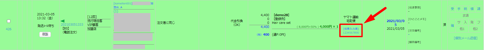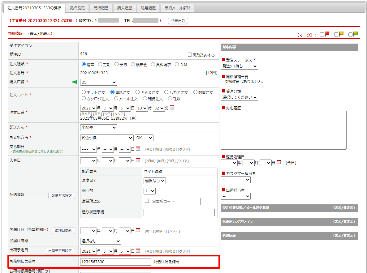 受注詳細画面では「お荷物伝票番号」欄に伝票番号が表示され、「出荷日」欄の日付が更新されます。