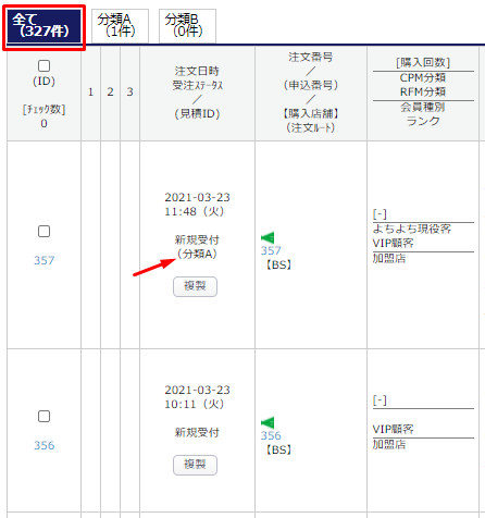 受注>受注一覧:検索結果一覧 にて「分類A」をクリックし、分類Aの受注を表示します。