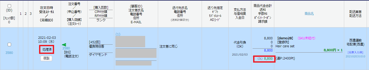 受注ステータスの変更や入金日、入金金額の反映を確認できます。