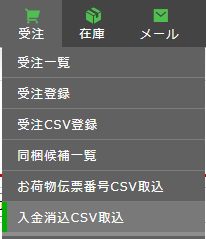 2. 受注 > 入金消込CSV取込 から、ダウンロードしたCSVファイルをアップロードします