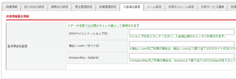 基本設定>店舗設定>[入金消込設定]タブ で”ID”設定が必要になります。
