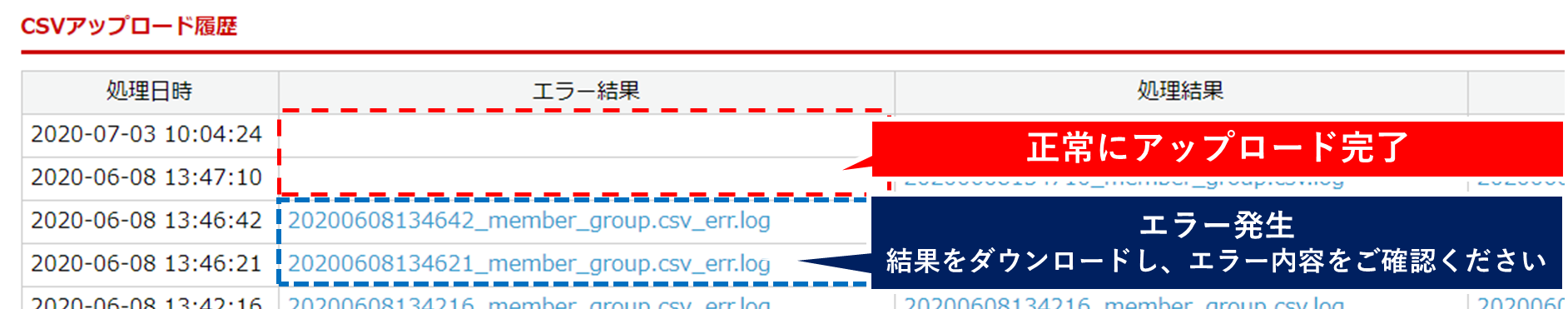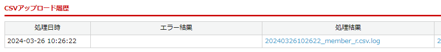 アップロードが完了すると、同ページ下部の「CSVアップロード履歴」に結果が表示されます。