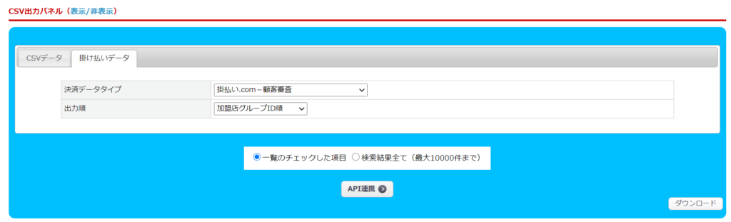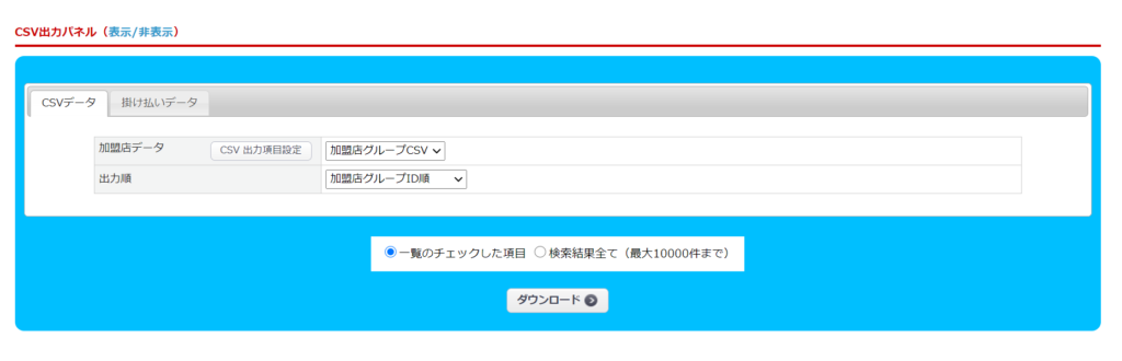 検索結果一覧でチェックが付いている加盟店グループがAPI連携、もしくはCSV出力されます。