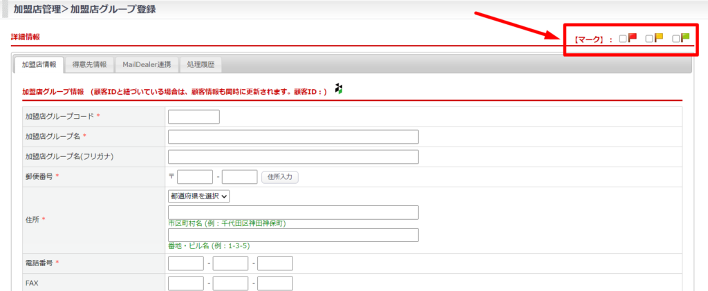 加盟店 > 加盟店グループ管理 > 加盟店グループの詳細画面の右上にて、内部管理用のマークを任意で設定できます(複数設定可)。