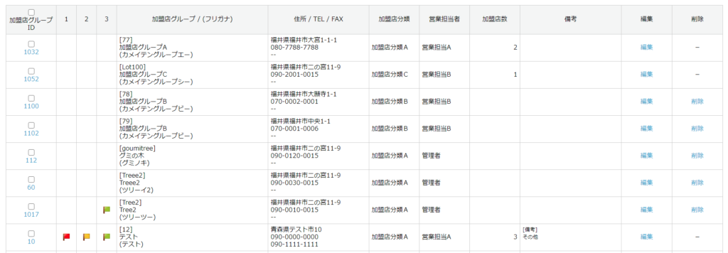 登録された加盟店グループが検索条件に基づいて一覧表示されます。