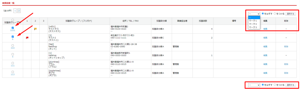 一覧のチェックボックスにチェックを入れた加盟店グループに対して