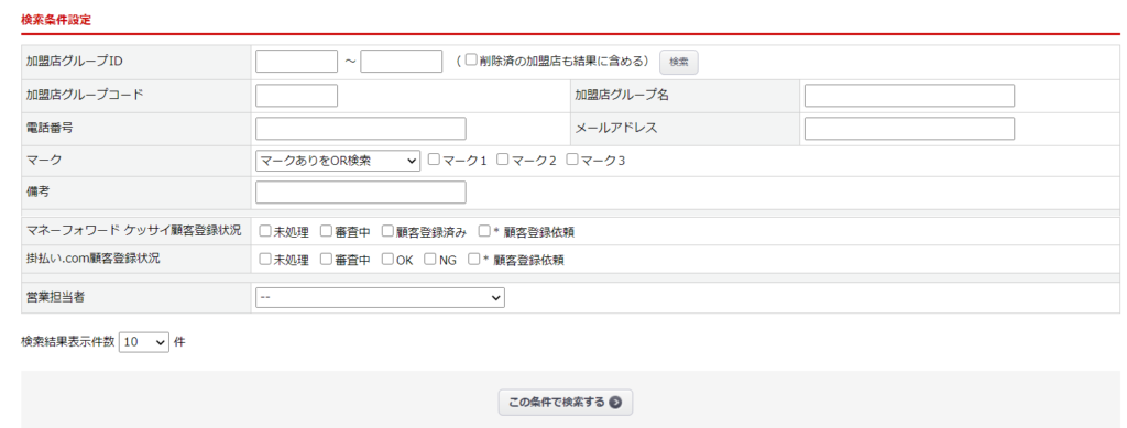 | 加盟店グループ名 | 登録された加盟店グループ名を条件に部分一致で検索します。 |