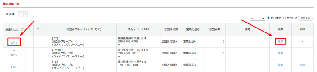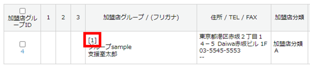 加盟店 > 加盟店グループ管理 画面下部の検索結果一覧にて、対象の加盟店グループID、