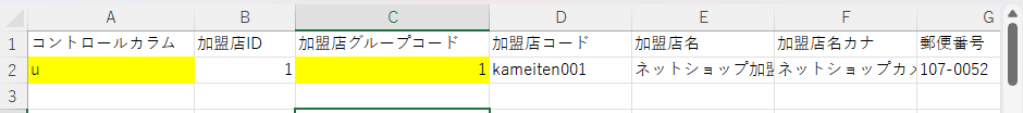 ・C列 加盟店グループコード:紐づけ先のコードを記載(加盟店グループIDとは異なります)