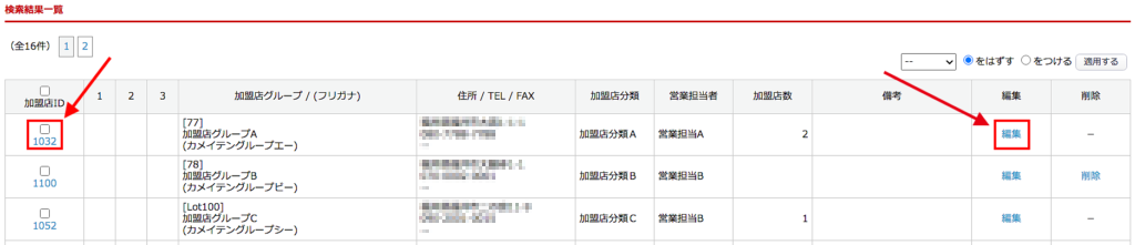 加盟店 > 加盟店グループ管理 画面下部の検索結果一覧にて、対象の加盟店グループID、