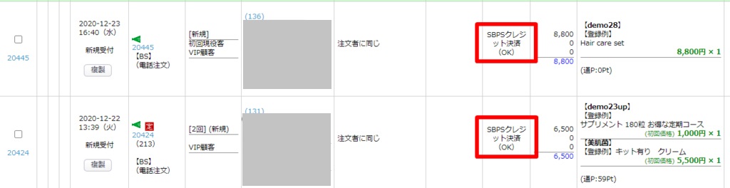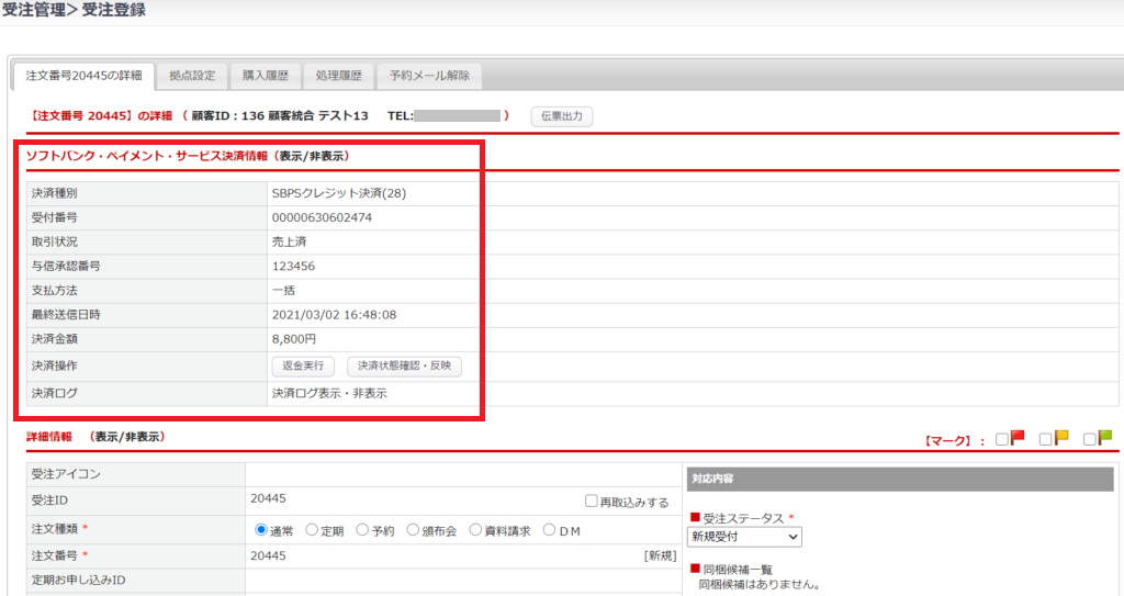 受注登録画面上部に「ソフトバンク・ペイメント・サービス決済情報」が表示されます。