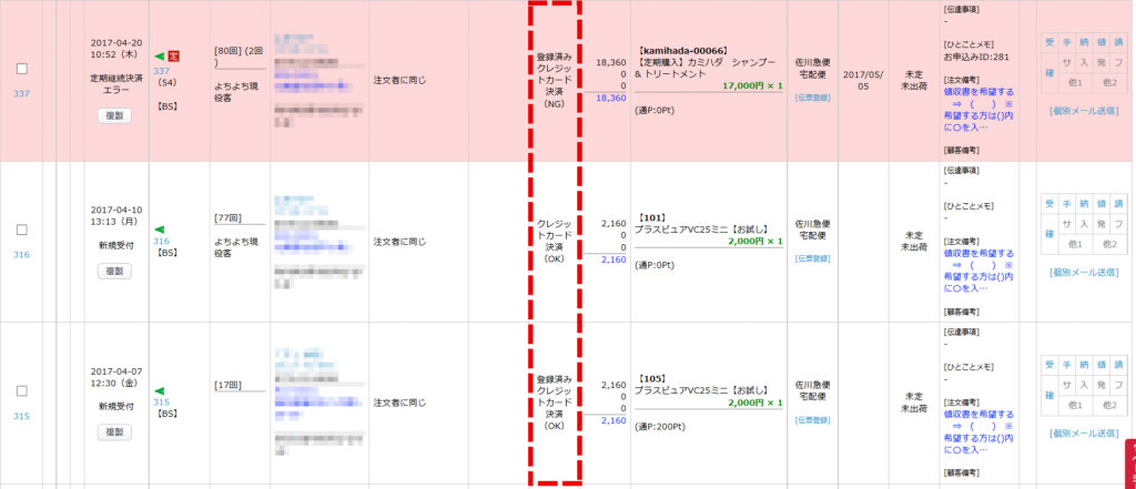 - 支払方法の下の()内が審査結果です。
