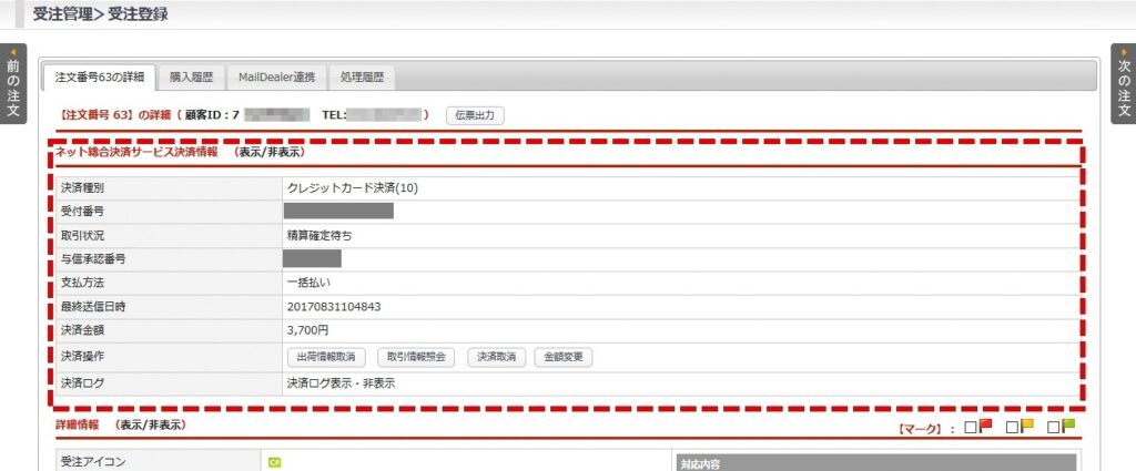 - 受注登録画面上部に「ネット総合決済サービス決済情報」が表示されます。