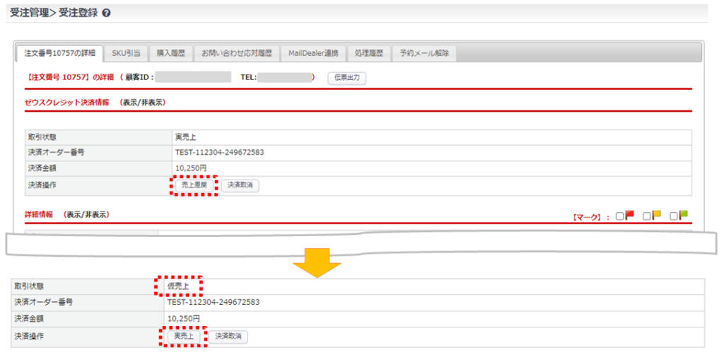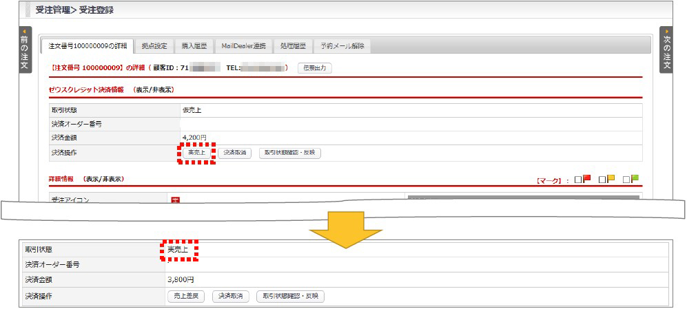 決済操作より【実売上】ボタンをクリック→完了すると取引状態が「実売上」となります。