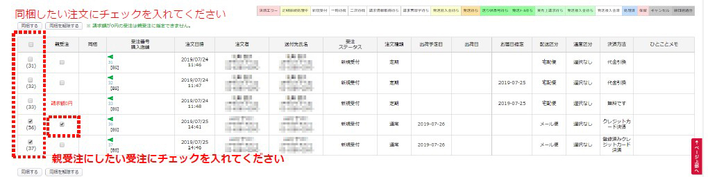 受注 > 同梱候補一覧※表示がされなければ「同梱候補の再表示」で表示されるか確認