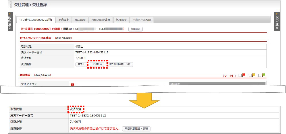 受注登録画面からオーソリ取消(決済取消)を行う場合