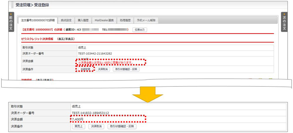 決済操作より【決済金額変更】ボタンをクリック→完了すると決済金額に変更後の金額が反映され、注意表記が消えます。