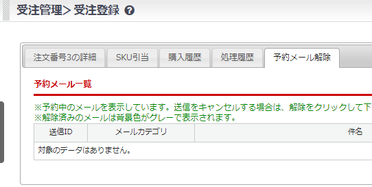 受注 > 受注一覧 > 該当受注の詳細画面 >「予約メール解除」タブ