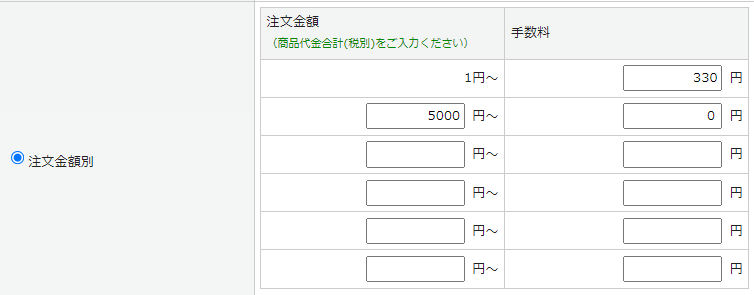手数料(税込)*手数料を設定してください。一律、または金額別に設定可能です。