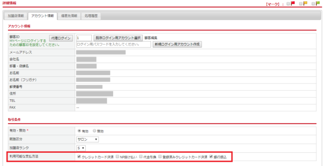 設定したい加盟店の編集画面からアカウント情報タブを開き、