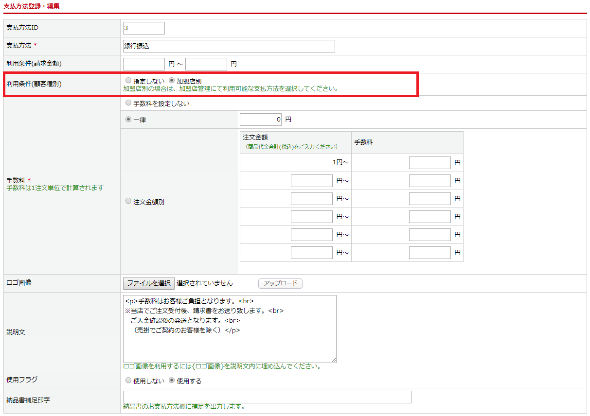 設定したい支払方法の利用条件(顧客種別)にて「加盟店別」を選択してください。