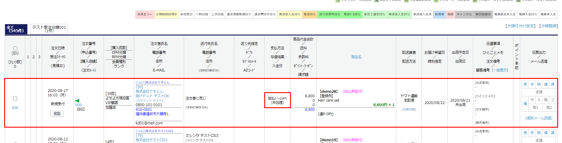 支払方法:掛払い.com(未処理)の受注データが作成されます。