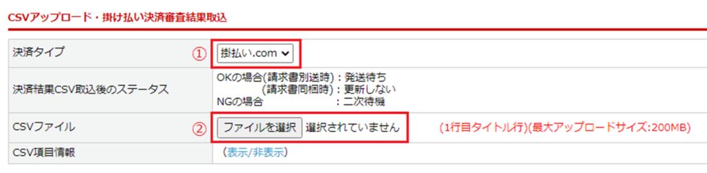 ②各掛払い決済の管理画面からダウンロードした審査結果CSVファイルを選択します。