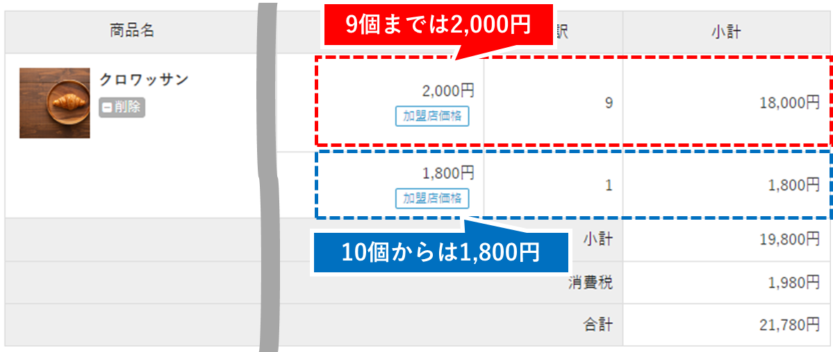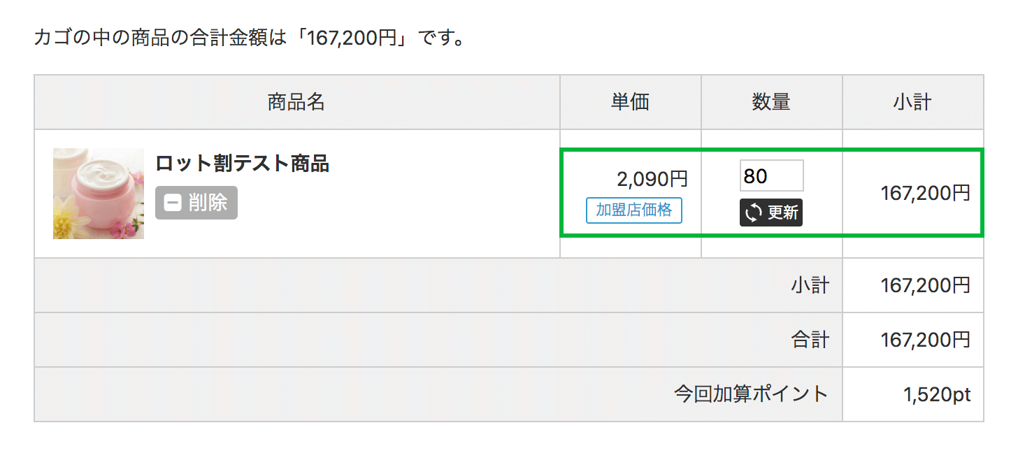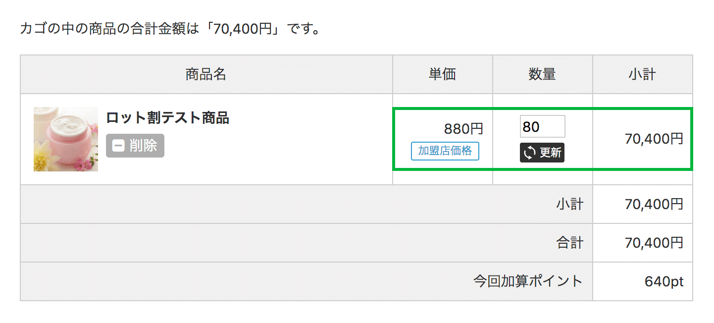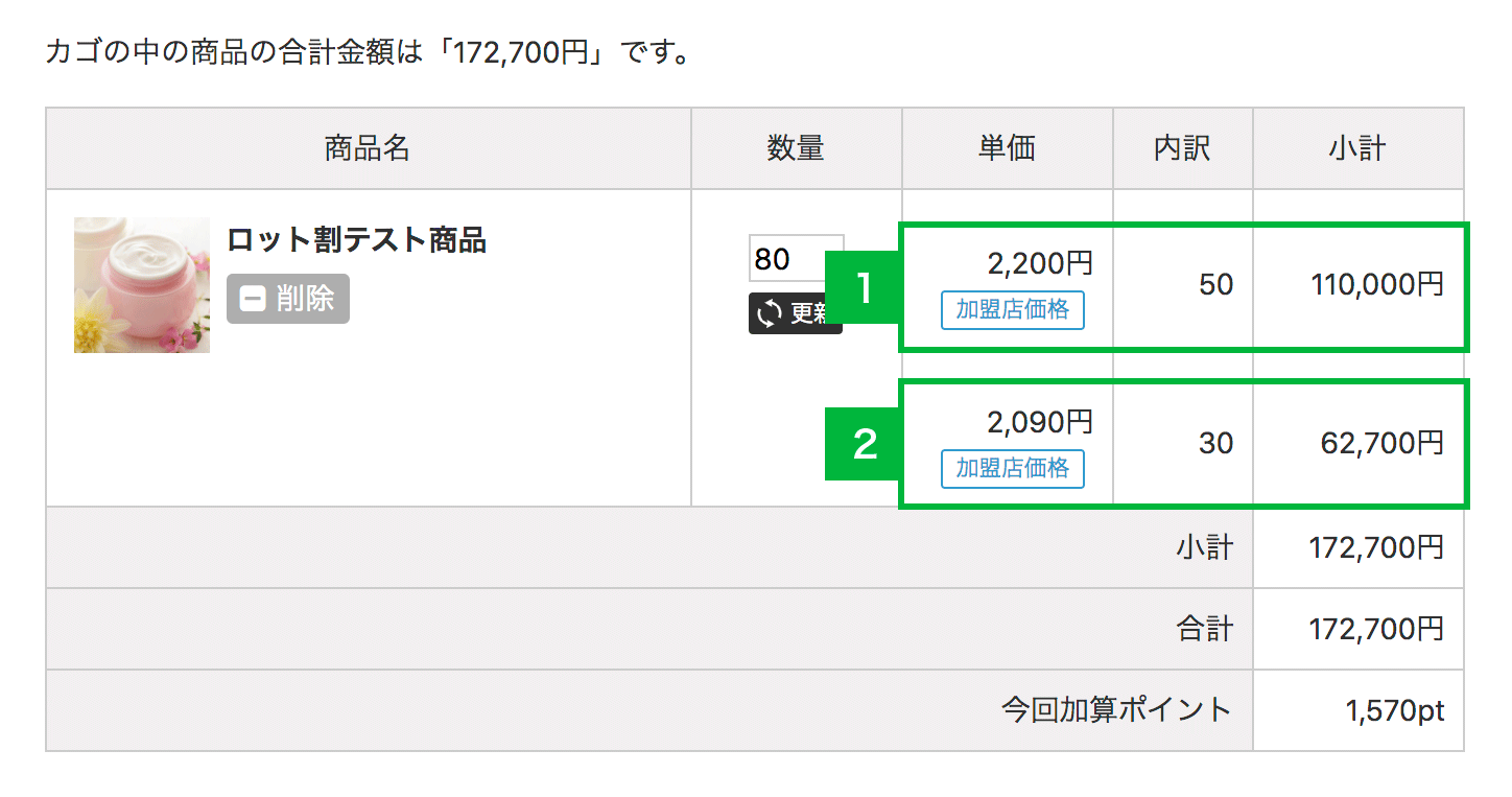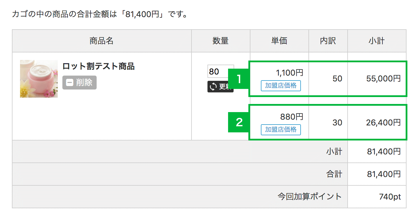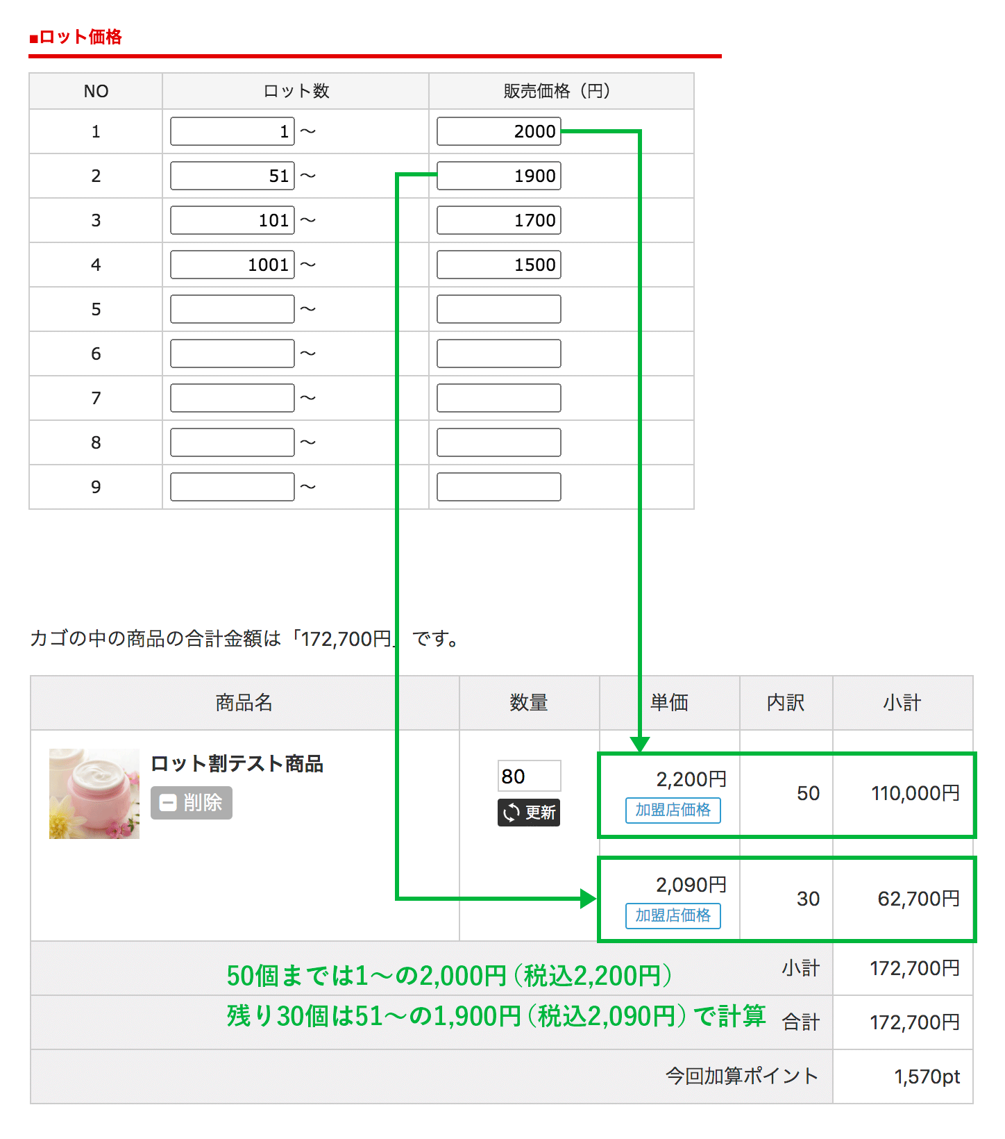…加盟店別ロット価格を以下のように設定。該当する加盟店が、商品80個をカートに入れた場合…