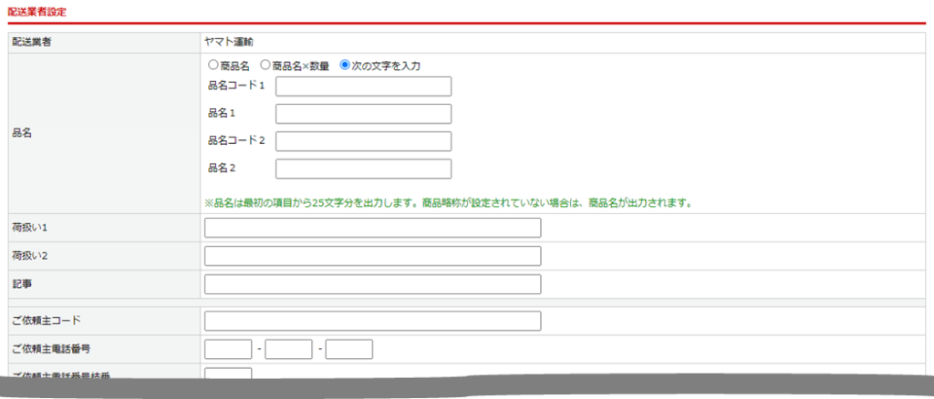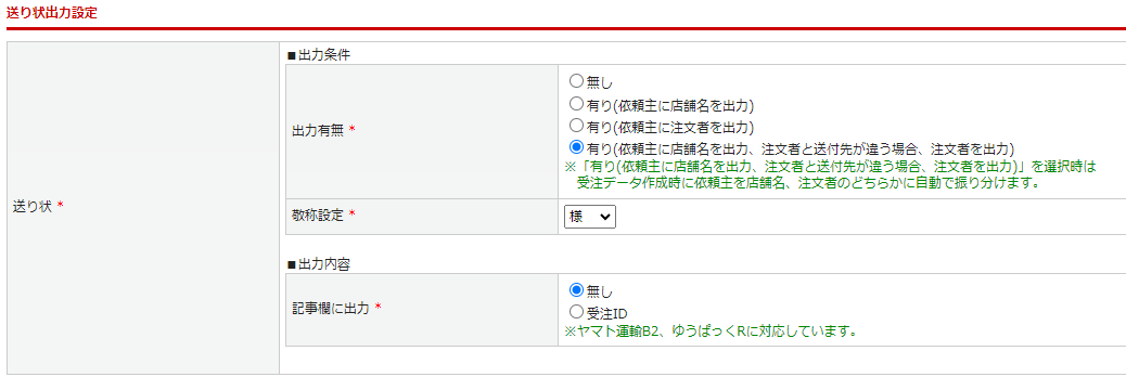 | 記事欄に出力 | 送り状記事欄に受注IDを出力したい場合、[受注ID]を選択してください。 |