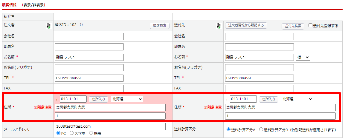・離島登録した住所が送付先に登録された際、受注一覧と受注登録画面で注意メッセージが表示されます。