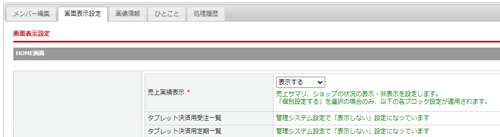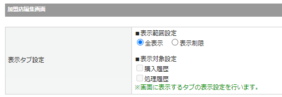 表示タブ設定加盟店編集画面の表示タブを設定します。